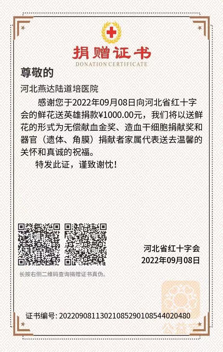 2022年河北燕達陸道培醫(yī)院向河北省紅十字會捐款。