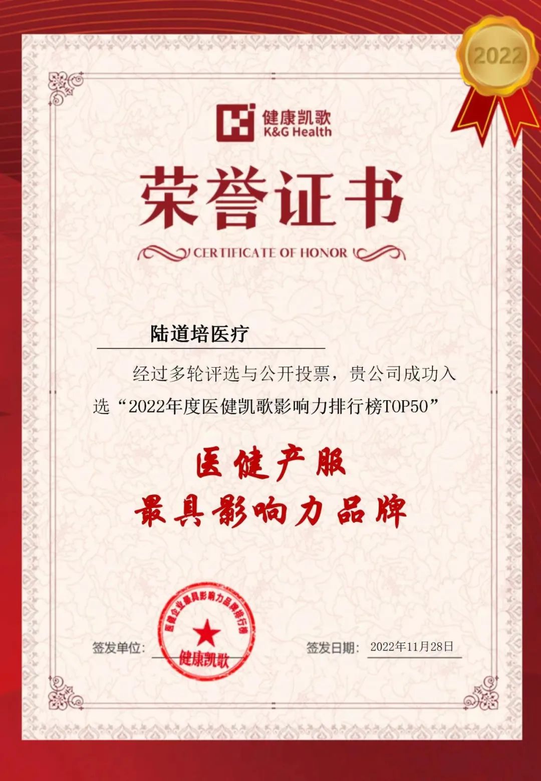 2022年第二屆醫(yī)健凱歌影響力排行榜榜單揭曉。陸道培醫(yī)療集團(tuán)成功入選“第二屆醫(yī)健企業(yè)最具影響力品牌排行榜TOP50”,榮膺醫(yī)健產(chǎn)服最具影響力...