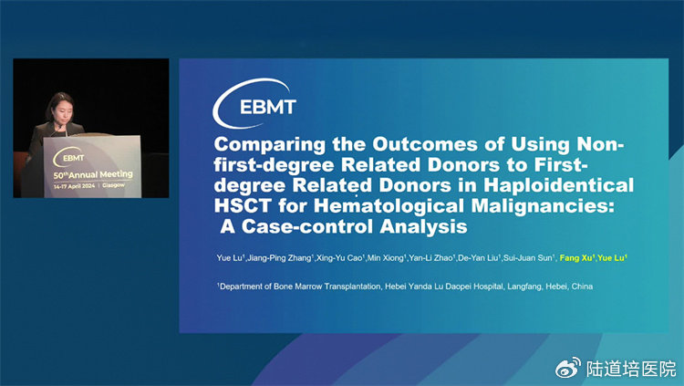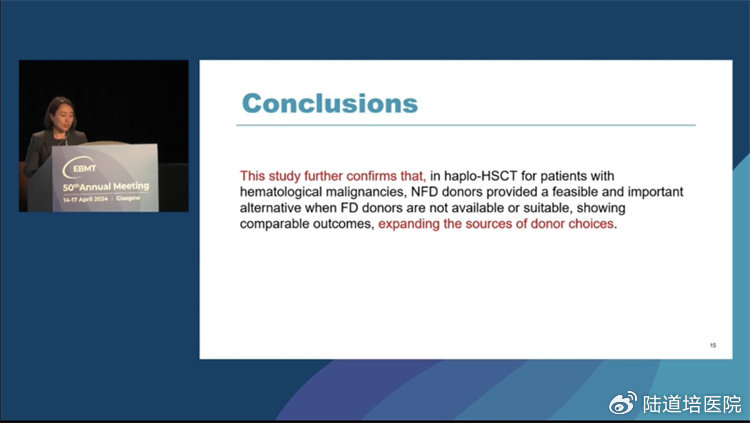 當(dāng)?shù)貢r(shí)間,4月16日下午15:15,由陸道培醫(yī)院骨髓移植科胥方醫(yī)生代表盧岳主任團(tuán)隊(duì)在“Optimising donor Choice”環(huán)節(jié)中,口頭匯報(bào)了“Comparing the Outcomes of Using Non-First-Degree Related Donors to First-Degree Related Donors in Haploidentical HSCT for Hematological Malignancies: A Case-Control Analysis”的臨床研究成果,研究證實(shí)了在單倍體造血干細(xì)胞移植中,采用非直系供體在療效及安全性方面均可以與直系供體相媲美,這也為臨床上擴(kuò)展單倍體移植供者的可選擇范圍提供了進(jìn)一步的證據(jù)支持。盧岳主任團(tuán)隊(duì)這一項(xiàng)研究受到了頗多關(guān)注。